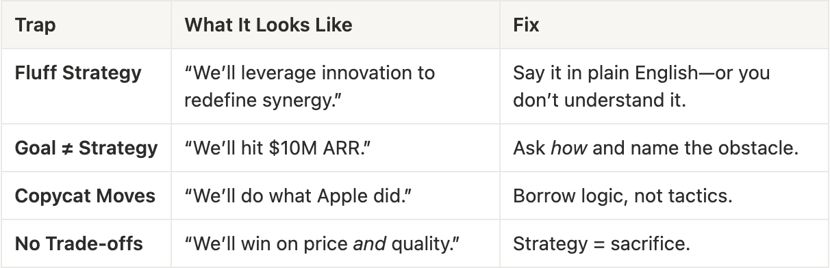 As Richard Rumelt puts it, strong strategy has three parts: a diagnosis of what’s really happening, a guiding policy for how you’ll tackle it, and coherent actions that reinforce each other.